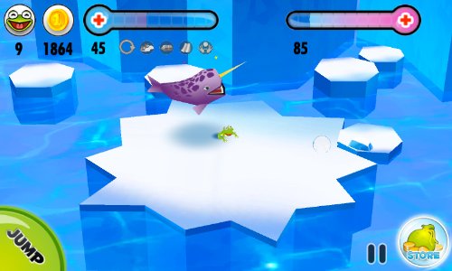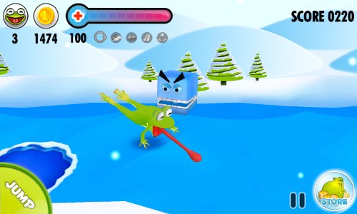 In Frog on Ice you collect coins to buy stuff in the store. Collect coins by finding them throughout the level, or simply purchase them separately. With the coins, you can buy extra lives and continues. Temperature running low? Hit the store button in the middle of a boss battle to replenish health. Best of all you, can purchase Power-Ups that greatly enhance Plop’s abilities and the game play itself. It’s all part of the game.