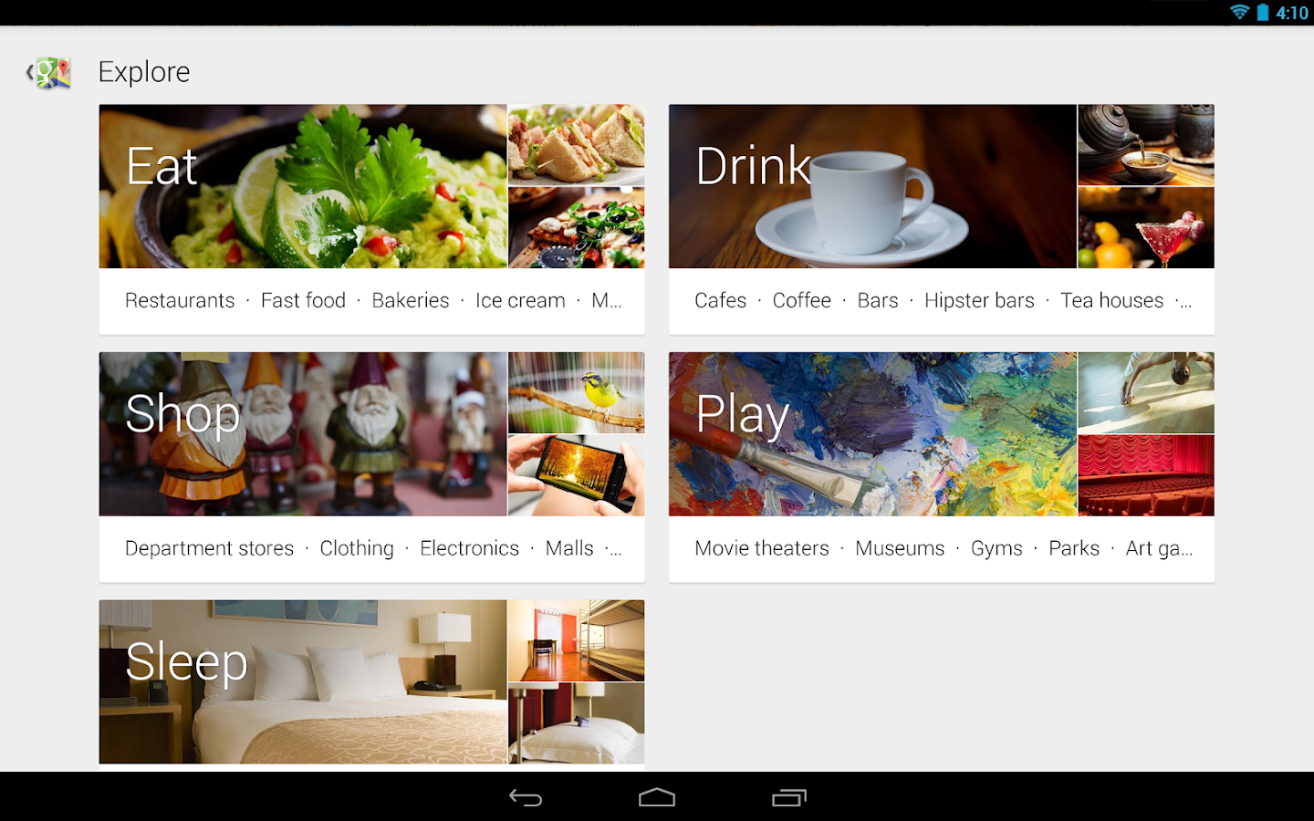 - Explore: a new way to browse and discover popular local places to eat, drink, shop, play and sleep