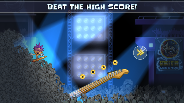 Smash your guitar, speed up and jump into the cheering crowd! Rush through the concert hall and get carried away by your freaked-out fans. Perform crazy stunts, collect golden coins and use amazing power-ups to entertain the party crowd! Avoid flying obstacles like bombs, bananas and the occasional burger.